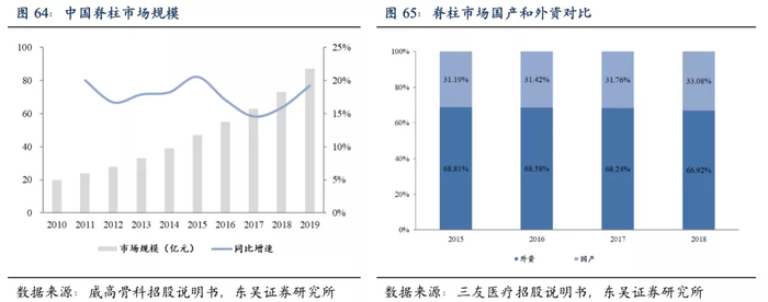 2019年我国脊柱类植入物行业规模87亿元,同比增长19.18%。2010-2019年复合增长率达到17.75%。脊柱市场由外资占据主导,2018年国产份额仅33.08%,仍具有较大进口替代空间。
