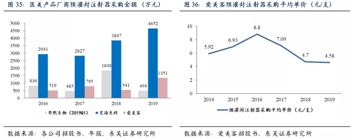 一次性肉毒素注射剂、一次性玻尿酸注射剂等注射填充类项目是非手术整形美容首选,小剂量、高价格的医美产品普遍应用预灌封注射器包装。如华熙生物、昊海生科、爱美客等厂商的原材料采购中,预灌封注射器采购金额整体呈上升趋势。