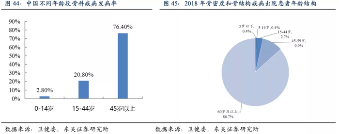 。根据卫健委发布《2018中国卫生健康统计年鉴》显示,我国居民在14岁以下骨科类疾病发病率为2.8%,15-44岁的发病率为20.8%,而45岁以上的发病率则达到了76.4%。2018年骨密度和骨结构疾病出院人群中,45岁以上患者占比高达96.6%,60岁以上患者比例则为86.7%。