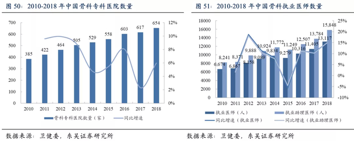 骨科医疗需求的释放离不开医院的建设和专业医师的培养。过去受手术技术限制,相关手术主要在三级医院开展,如今随着基层医院设施的不断完善以及执业医师数量的提升,二级及以下医院能够从事骨科手术的医生资源逐渐增大,大批骨科专科医院也纷纷建立。2018年中国骨科专科医院数量为654家,同比增长6%,执业医师数量为13117人,同比增长15%,执业助理医师数量为15848人,同比增长15%。