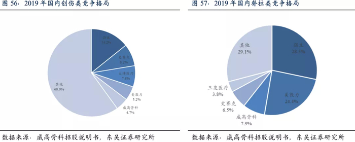 从细分领域竞争格局看,创伤领域国产龙头大博医疗仅占据7.8%的市场份额,威高骨科占据4.7%的份额,脊柱领域国产龙头威高骨科占比7.9%的市场份额,未来仍有较大的提升空间。