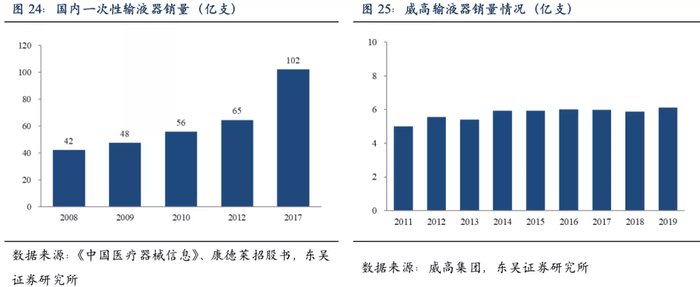 据康德莱招股书,2017年我国一次性输液器销量估计约102亿支。2017年威高输液器销量总计5.9亿支,国内市占率约6%,其中TPE输液器在国内专用高端输液器市占率达85%。随着公司产品由低端的常规输液器转向中高端产品如超低密度聚乙烯输液器、高效过滤避光输液器和微剂量高效过滤输液器等,公司输液器有望实现稳健增长。