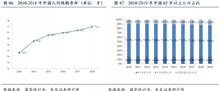 近年来,中国人均预期寿命不断提升,从2010年的74.8岁提升到2018年77岁。加上实行多年的计划生育政策,导致中国人口老龄化持续加剧,中国65岁以上人口比例从2010年的8.9%上升到2019年的12.6%,未来这一比例还将继续提升。