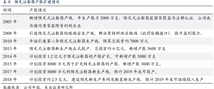 公司的预灌封注射器于2005年作为国内首家专利获批,2008年公司通过引进玻璃管生产线,解决原材料供应瓶颈(此前依赖进口),提升盈利能力。自2010年以来,公司持续扩大产能,根据公司公开数据,2021年预灌封产能有望达6亿支。