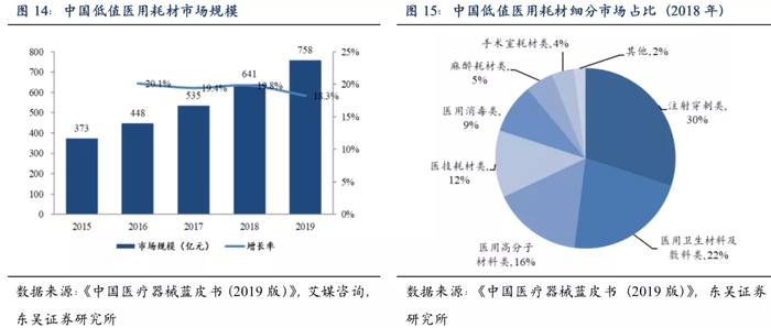 随着中国经济发展与社会老龄化加速,医疗需求与科技水平的不断提高,中国医疗器械行业进入快速发展期,安全留置针、活检针、美容针、新型敷料、预灌封注射器等一次性耗材产品实现换代升级,消费升级和产品附加值提升推动行业空间扩容。根据《中国医疗器械蓝皮书》与艾媒咨询数据,2015-2019年中国医用低值耗材市场规模由373亿增长至758亿元,年均复合增速20%左右。