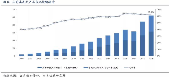 公司持续优化产品结构,高附加值的品种如留置针、预充式注射器、关节类骨科耗材、介入器械等带动整体毛利率提升,2004年-2019年公司毛利率水平从40%提高至62.8%。2004年以来公司高附加值产品(毛利率>60%)的收入占比从19.4%提高至60.2%,公司整体盈利能力持续提升。