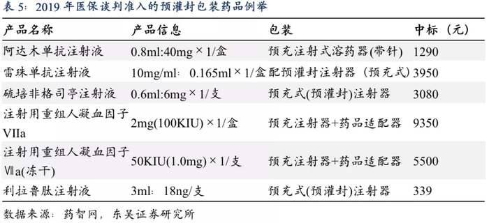 对于价值高昂的生物药,预灌封注射器药物使用率较高,如2019年医保谈判准入的阿达木单抗注射液、雷珠单抗注射液、利拉鲁肽注射液等药品都有预灌封包装。根据药智网数据,在2020上半年中标的注射剂药物品种中,至少有10种药物、19种规格为预灌封注射器包装。