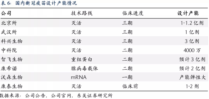 随着价值较高的国产新型疫苗和消费类疫苗的崛起,预灌封注射器(尤其是国产预灌封注射器)的渗透率有望持续提高。另外,此次公共卫生事件的爆发扩大了预灌封注射器的需求。按照临床研发进度来看,中生集团武汉所、北京所产能合计超过2.2亿剂,科兴生物产能超过3亿剂,智飞生物产能预计可达3亿剂,康希诺设计产能为2亿剂,沃森生物的mRNA疫苗由于其本身的技术优势,产能弹性较大。