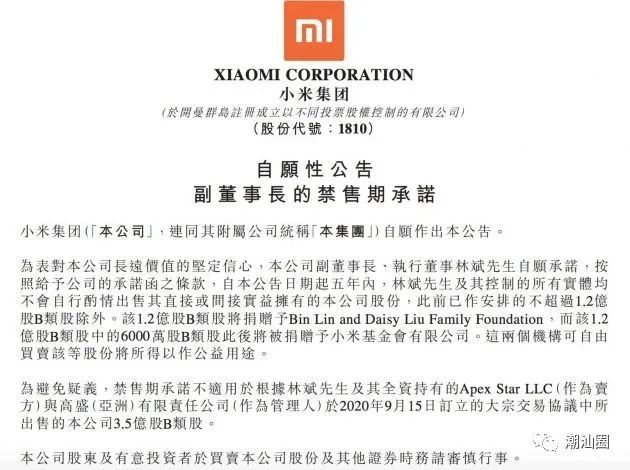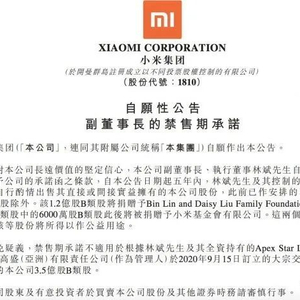 2020年9月15日,小米集团(01810)发布自愿性公告,公告称小米集团副董事长林斌通过高盛转售3.5亿B类股,林斌剩余股份会锁定五年,即自9月15日起五年内,林斌及其控制实体均不会再出售股份,此前已安排捐赠给家族慈善基金的1.2亿股B类股除外。