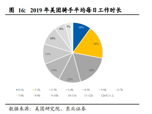 2019年美团骑手总数达到398.7万人。疫情爆发后,2020年上半年,新增骑手达到138.6万人。外卖骑手在疫情中成为了“城市摆渡人”,美团外卖则成了餐饮行业复苏背后“无形的手”。从工作时间上来看,超过80%的骑手,日工作时长不超过6小时。