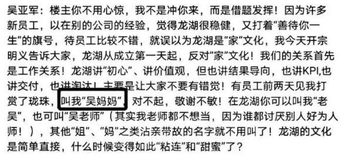 吴亚军还在回帖中称:“有员工前两天见我打赏了珑珠,叫我‘吴妈妈’,对不起,敬谢不敏!”