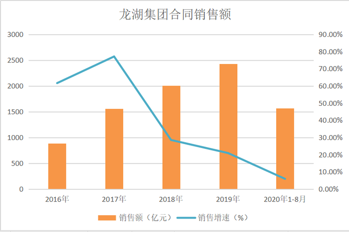 虽然销售额逐年上升,但自从2017年公司销售规模突破千亿之后,龙湖集团的销售增速就开始不断下滑,2018年、2019年,龙湖集团的销售额增速分别为28.5%、20.9%,2020年1至8月,进一步下滑至5.88%。相较于2017年的77.1%,下滑幅度惊人。