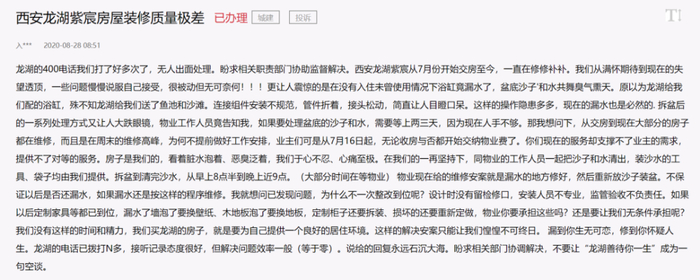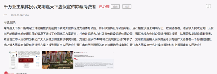 2019年过去,龙湖集团依然被“维权”缠身。在人民网的“地方领导留言板”中,今年龙湖业主的投诉频频出现,包括:晋江龙湖嘉天下项目、西安龙湖紫宸项目、濮阳龙湖湾锦城等,根据回复,相关部门已组织调查上述项目,目前均在协商解决。