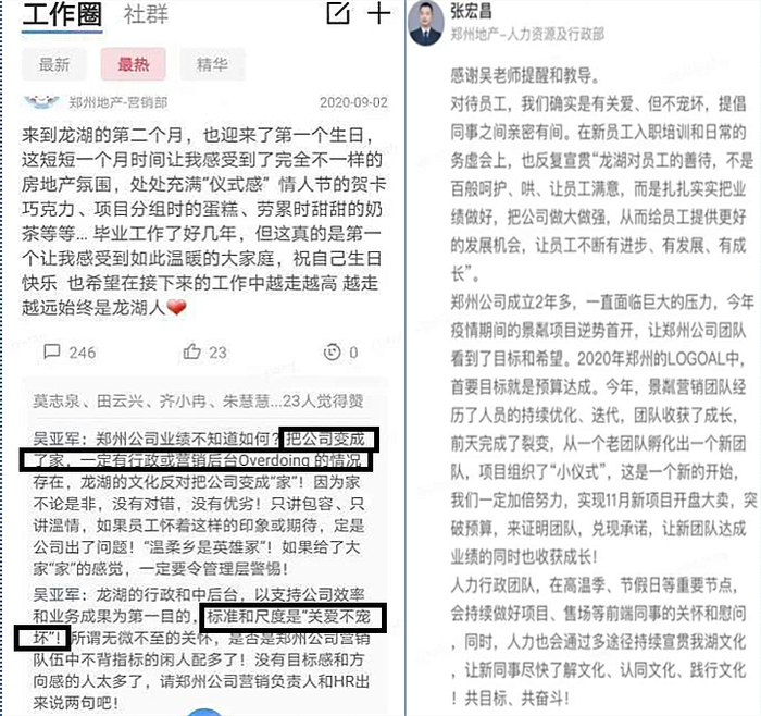 据了解,在这篇240多条评论的帖子里,吴亚军评论了10多条,她反复重申龙湖的企业文化是反对“家文化”,并且点名让郑州公司的HR出来讲两句。