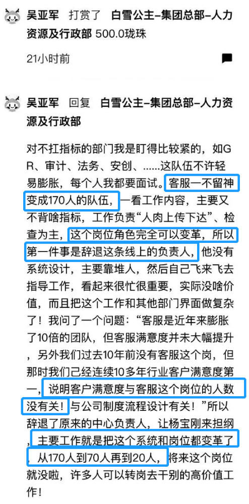 “打赏珑珠”一事,说的是吴亚军打赏人力资源部,同时发表对客服队伍的规划,简单来说有三点: