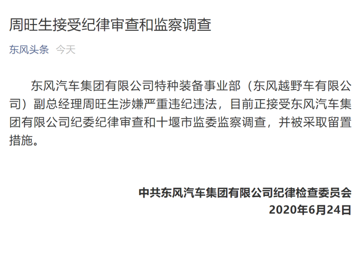 然而就在今年6月28日,据东风汽车官方媒体号,东风汽车集团有限公司特种装备事业部(东风越野车有限公司)副总经理周旺生涉嫌严重违纪违法,负责研发的前东风汽车集团有限公司副总工程师陈建贤因严重违法违纪接受审查。