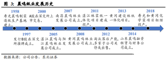 公司前身是1958年成立的山东寿光造纸总厂,同年建立寿光晨鸣生产基地,1993年进行股份制改造,1997年、2000年及2008年分别发行B股、A股、H股,成为全国首家A、B、H三种股票上市公司,2014年成立山东晨鸣融资租赁有限公司,涉足金融板块。