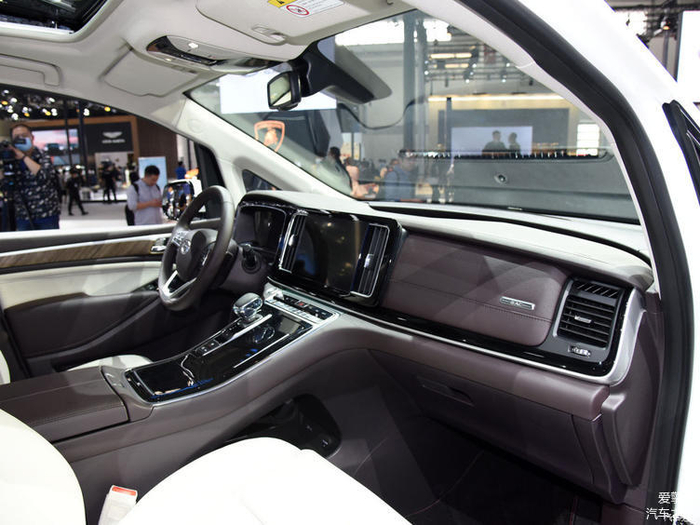在内饰设计上,两台车的路线也是截然不同。广汽传祺M8显然更像是一台MPV,整个中控台的位置更高,厚重感也更强。由于将传统的空调控制面板尽可能缩小,所以挡把的位置也就设计得相对靠前靠上一些,在前排中央通道处也就留出了更多的储物空间。