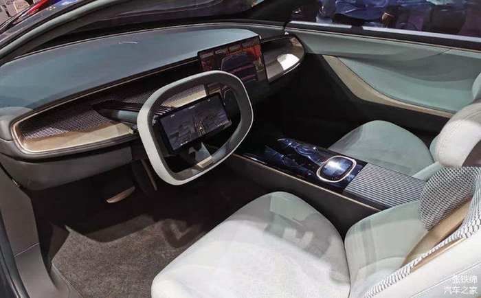内饰部分使用了非常简约的风格,中控台使用了一个环状的中控面板,使用金属质感的装饰,仪表盘被做成了一块大显示屏,放在了方向盘的中间,方向盘的造型更像是游戏机手柄。大尺寸的中控大屏使用悬浮式的结构。中央地台上是带有不同色彩氛围灯的功能区域,看上去科技感十足。
