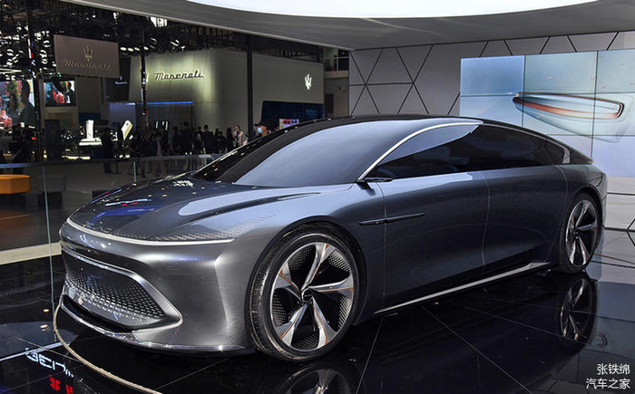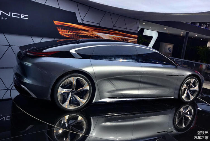 新车侧面的造型设计也非常个性前卫,看上去更像是溜背式的大两厢轿跑造型,车顶向车尾的过渡非常平滑,车窗上沿的镀铬装饰在C柱形成一个拐角造型。整个侧面以圆滑的曲面线条过渡为主,没有太犀利的线条,但是看上去依旧是非常动感的。