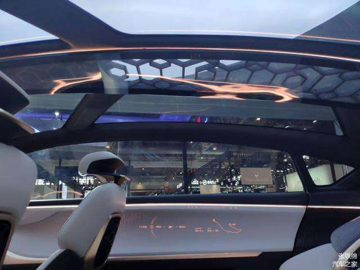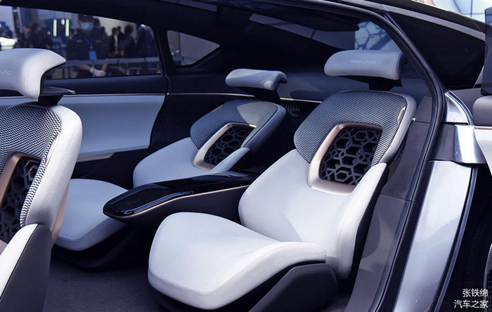 概念车使用了对开式的车门,无B柱车身结构,后排是两个独立式的座椅,座椅的造型非常有设计感,靠背中间还使用了传统元素的镂空图案装饰,两个座椅中间是一个多功能的扶手箱。后排的空间看上去非常宽敞,而且车顶还采用了全景天幕样式,带有氛围灯装饰,车内非常通透。整个车内给人非常年轻而又轻奢化的感觉。