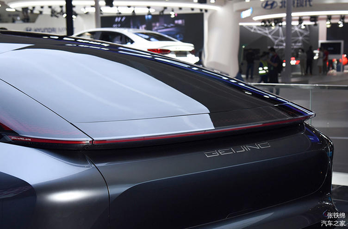 全车外观最帅气的部分就是车尾了,溜背式的C柱延续到尾部之后形成折角造型,营造出了尾翼的效果,而贯穿式的尾灯就被放在了折角式的尾翼上,这个位置看上去有点UFO的感觉,十分科幻,而且又精致感十足。后备箱盖部分的造型凹凸有致,虽然整体很简洁,但是看上去非常动感。