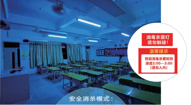 结合当下疫情防控需求,教室配备有紫外线消毒杀菌灯(无臭氧型),通过智能控制自动在凌晨2-3点间进行消毒杀菌,智能感应设备只要感应到教室里有人在的情况下,紫外灯便会自动处于断电状态,安全性能得以保证。