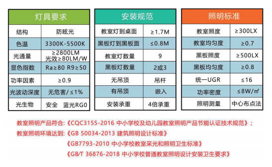 雷士照明打造的课室专用照明灯盘及黑板灯无蓝光、无眩光、无频闪、色温为3300-5500k,均达到国家标准,提供明亮舒视的学习环境,能够更好地保护孩子们的双眼。以CQC和GB为基础,从产品、安装、实际效果三方面出发,营造健康的教室照明环境。
