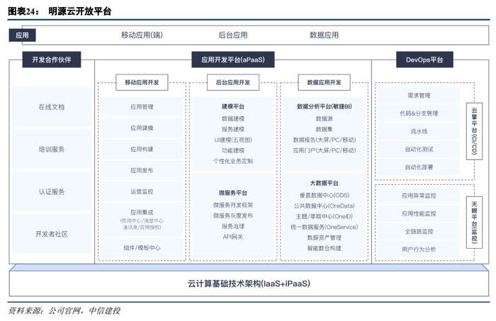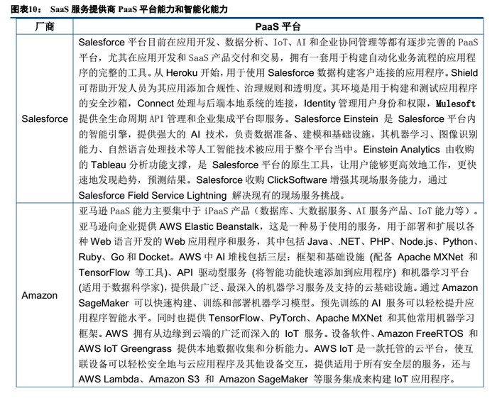 国内外云计算巨头Salesforce、微软、阿里巴巴、SAP、Workday较早推出PaaS平台支撑大型企业的数字化转型、定制化需求和SaaS功能的持续迭代。以阿里巴巴为例,阿里云在数据智能化和协同办公积累了非常丰富的经验,将自身能力归纳成了三大核心中间平台:大数据平台、移动协同办公平台、AIoT平台,服务企业客户对智能化技术的需求。同时阿里云实行“云钉一体”战略后,钉钉所拥有的企业级低代码开发平台“宜搭”将在企业级服务和企业应用开发发挥更大作用。2019年至今国内PaaS呈百花齐放的状态。用友、金蝶、有赞、明源云、浪潮、北森、销售易等业务垂直SaaS提供商和垂直行业SaaS提供商,如今都有自己的PaaS平台,且仍然在持续加大研发投入力度和生态拓展速度。总体来看,公有云巨头如亚马逊、阿里巴巴、Salesforce等依靠强大的iPaaS、APaaS能力,AI、大数据、IoT等各项智能化技术,将在公有云领域加强自身优势,同时非IaaS业务将实现快速增长。而SaaS服务提供商依靠PaaS平台能力和智能化能力提升对行业内中大型企业的整体解决方案能力和龙头优势。