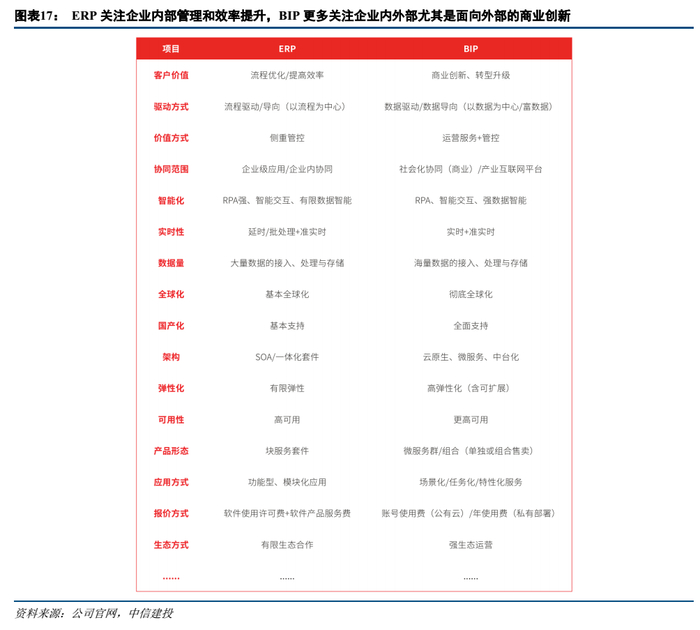 ERP关注企业内部管理和效率提升,BIP更多关注企业内外部尤其是面向外部的商业创新。传统ERP服务更多针对企业资源的管理计划,BIP不仅提供核心财务、采购、人才管理、供应链管理以及内外部协同、敏捷个性化配置等能力,还为企业内外部开发者提供应用开发、系统集成能力,可以让企业客户借助合作伙伴,构建新业务,可以为企业各个业务场景提供SaaS服务,通过“搭积木”方式为企业构建智能的核心。BIP的驱动方式以数据驱动为中心,是数据+算法+流程,而ERP则以流程驱动为中心,是流程+数据;从协同层次来看,ERP为企业内协同,BIP除了企业内协同,更重要是企业间的协同,是基于价值网/社会化范围更广的商业协同;从生态方式上,ERP是有限的生态,到了BIP是强生态共生的关系,在这个平台上有大量的不同类型服务提供商来共同服务企业的商业创新,共同服务各行业企业的商业创新。BIP是集工具、能力、资源在内的更加综合的多元服务平台。