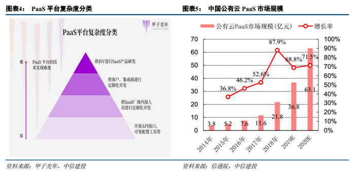 数字化转型和中台发展让应用开发平台APaaS需求大幅增长。APaaS(application platform as a service),应用部署和运行平台,是PaaS平台的重要分支之一,主要解决的是单个SaaS应用如何构建的问题。基础PaaS提供容器、云数据库等云中间件,APaaS则更注重开发效率和应用创新。APaaS具有web服务和API特性,即使是非IT人员也能够开发应用程序。APaaS提供了一个相对安全、自由的环境,可轻松地构建数据库程序,进行应用开发扩展,并可定制化创建应用,客户几个小时内就能完成开发、测试、部署等流程。最重要是的,APaaS以低代码、零风险特征著称,从根本上提升了用户体验,解决了快速迭代的问题。企业在数字化转型改造业务流程和基础设施,首先需要结合云计算技术实现对底层基础软硬件资源的统一管理,其中虚拟化实现资源的快速交付,容器实现应用的快速部署,微服务架构实现应用开发的拆分;其次需要资源和共性组件模块化、PaaS 平台化,低成本定制开发适配多种业务场景和职能需求的 IT 工具产品,从而实现 IT 工具服务的敏捷交付和自服务式使用。因此企业大规模数字化转型和中台化趋势让国内PaaS需求进入高速增长期。
