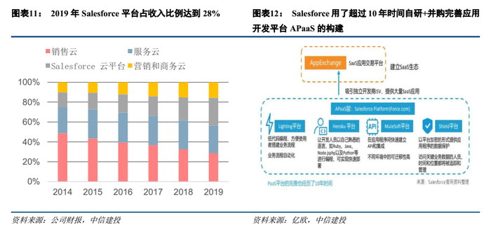 美国云计算龙头Salesforce在从服务中小企业为主转向服务大型企业过程中,构建了底层PaaS平台包括应用开发平台、AIoT平台、大数据服务、集成和API管理,以及上层企业管理和营销销售相关的各类SaaS服务包括:销售云、服务云、客服云、电商云、行业云应用,帮助企业完成销售全流程、企业管理解决方案。2005年以前Salesforce依靠十几万家中小企业客户实现了SaaS服务销售额高增长,转向服务大型企业过程中遇到最大问题是定制化开发和交付,因此从2005年创建了AppExchange平台,允许第三方SaaS应用开发者在平台上开发和发布SaaS产品,并供他人免费或收费订阅,公司不收取费用。2008年Salesforce推出了全球首个APaaS平台Force.com,支持应用程序在云端的开发、部署和运行,提供软件开发中的基础工具给用户,包括数据对象、权限管理、用户界面等。同时第三方开发者支付的平台使用费用也成为了Salesforce平台收入来源。截至2019年年底,平台SaaS应用超过5000个,服务客户超过500万。Salesforce的平台收入也逐年增长(有外延并购收入),到2019年平台占收入比例达到28%。