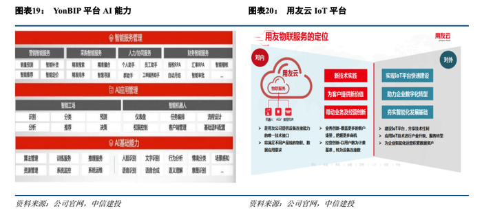 BIP平台集成AI智能分析、IoT、区块链等多项技术能力。用友IoT能力与用友云平台融合,赋能用友云泛在设备连接、海量数据快速采集与传输、远程维护设备、故障诊断等能力,为工业物联提供专业数据服务,降低设备连接技术门槛。BIP平台的AI核心能力由智能工场和智能机器人两部分核心产品,智能工场面向企业,支持 Flink、Spark、TensorFlow、天元、飞浆等计算框架,模型工场支持数据准备、算法调用、模型训练等服务,提供数据统计、状态估计、分布式学习、强化学习等算法库,预置算法包括随机森林、决策树等机器学习算法,在销量预测、智能补货、智能推荐、智慧人力、智能财务等八大领域进行了应用模型封装。智能机器人 VPA 主要应用于友空间和 web 工作台上,可唤醒机器人完成安排会议、电话预约和日程安排等任务。而 RPA 流程机器人主要应用于不同场景下的应用系统连接。
