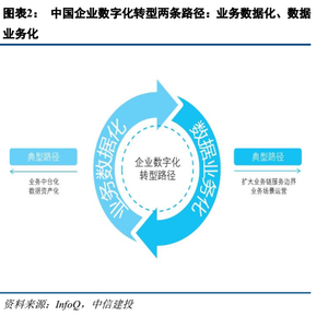企业数字化转型分为两条路径:大中型企业业务数据化,信息化能力弱的企业则是数据业务化。某些企业尤其是中大型企业已具备一定的技术和平台应用,如已有商城、CRM、ERP、客户服务等应用,此时可选择将业务进行数字化改造,沉淀业务能力和数据资产,对原有的应用进行升级改造和迁移,通过数据驱动业务的中台化,这条路径通常称为业务数据化。引入中台架构技术让业务和技术相互融合,不断扩展业务边界,不断增强支撑创新业务的能力,不断深挖数据价值。数字化运营模式依赖数据计算、数据模型和中台化技术的整合能力。有很多的企业(特别是食品酒饮、化妆品、消费电子等面临新零售业务场景多且复杂的企业)选择从数据中台切入,快速将企业现有数据进行数据化改造,通过建设数据中台,打破内部数据壁垒、盘活数据资产、提升数据价值,对外提供统一的智能化数据服务,重构企业大数据生态环境,进一步深挖和释放大数据的价值红利实现价值变现,在行业和市场竞争中赢得先机。根据艾瑞咨询预测,2023年中国数字中台市场规模将达到179.4亿元,保持45%的年复合增速。更多企业选择稳健的做法,即以某一创新业务作为突破口,尝试数字技术为其带来的改变并评估其商业价值,之后逐步改造原有业务,对业务模式、技术平台、组织管理、运营等方面进行渐进式调整,这样不至于对现有业务造成太大的冲击和影响。