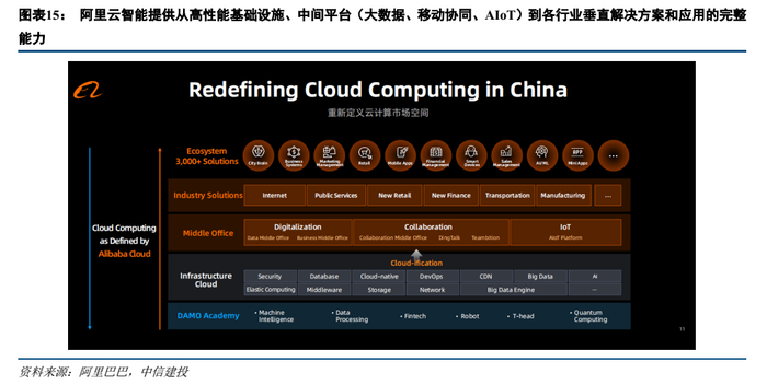 阿里云PaaS收入增长迅速,2020H1阿里云非IaaS类业务收入占比超过55%,中国企业尤其是大型企业和组织对PaaS平台、智能化需求、企业协作和IoT需求强烈,拥有巨大增长潜力。阿里云目前付费用户从2017年100万增长到目前300万,除了企业用户规模扩大,用户使用产品丰富度、大客户ARPU值也在不断提升。以A股上市公司客户为例,A股上市公司60%都为阿里云客户,且ARPU值从2018年到2020年保持40%的高增长。企业用户从原来只采购IaaS产品到今天偏向于购买IaaS+PaaS和一些SaaS类服务,也显示出用户对云计算的依赖度在不断增加,对云的依赖度在不断增加。阿里云增值服务(非IaaS服务)收入占比逐渐增加,根据阿里云披露截至CY2020 H1非IaaS服务收入占比已经达到了55%,这标志着中国企业对云需求从简单基础设施外包、基础资源采购,逐步升级到希望云能提供智能化能力、解决方案能力的转变。阿里云的非IaaS业务包含云安全、大数据、人工智能、企业级应用、物联网、开发运维等众多增值服务和平台。企业数字化转型关键除了基础设施的云化,更重要的是将应用打造成全面智能化、数据化。阿里云在数据智能化和协同办公积累了非常丰富的经验,因此将自身能力归纳成了三大核心中间平台:大数据平台、移动协同办公平台、AIoT平台。
