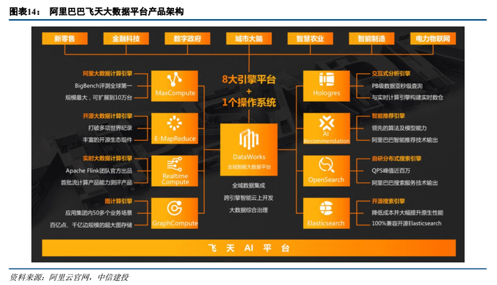 3)机器学习:阿里云机器学习平台PAI由自动化建模平台PAI-AutoLearning、拖拽式建模平台PAI-Studio、交互式建模平台PAI-DSW、云原生建模平台PAI-DLC、模型在线服务平台PAI-EAS组成;