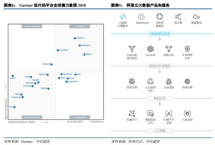 中大型企业实现数字化转型,应用开发将更多借助低代码平台HpaPaaS,组成自己的端到端解决方案。大型企业在数字化转型过程中,除了使用标准化产品,还需要基于应用开发平台开发个性化APP来组成完善的端到端解决方案和商业创新,因此低代码应用开发平台变得越来越重要。低代码指的是减少传统应用程序的代码编写量,主要通过图形化可视化界面,以拖放组件和模型驱动逻辑的方式,让更多业务人员和IT开发人员共同参与业务流程的优化,快速为Web端和移动端创建企业级应用,加速企业的数字化进程,产生“提高开发效率、降低开发成本”的核心应用价值。Gartner预测到2024年,低代码应用程序开发将占到所有应用程序开发功能的65%以上,大约66%的大公司将使用至少四种低代码平台。低代码应用程序开发平台具有多种方法,可帮助公司或非程序员在云中构建定制应用程序。平台提供的可视化开发环境允许多种不同的方法,如拖放一些组件,以平稳的方式构建应用程序。低代码开发平台两类核心玩家:云计算龙头厂商和通用低代码平台提供商。根据Gartner 2019年4月发布的低代码平台HpaPaaS全球领导者来看,Salesforce、ServiceNow、OutSystems、Mendix等排在前列,也代表了全球低代码开发平台的两类核心玩家:头部SaaS企业和通用平台企业。根据36氪总结,产业内目前对低代码开发平台HpaPaaS关注点主要集中在:实际成功交付了多大规模的客户;横向广度上能覆盖多少行业、领域的应用开发场景,纵向深度上能开发多复杂的应用场景;开发效率和开发成本可以优化到什么程度;有多少ISV基于平台进行原生应用开发,以及产生了多少应用数量;对客户数据量的处理能力等。