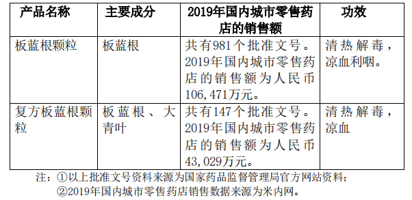 目前,板蓝根产品在国内市场已是充分竞争的产品,板蓝根颗粒、复方板蓝根颗粒已获批准的文号数量众多(如下表所示),板蓝根产品不是本公司或其附属企业的独家生产品种。