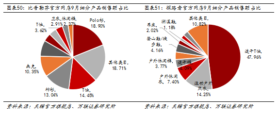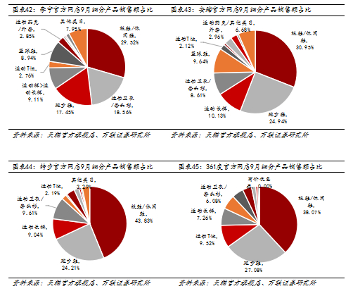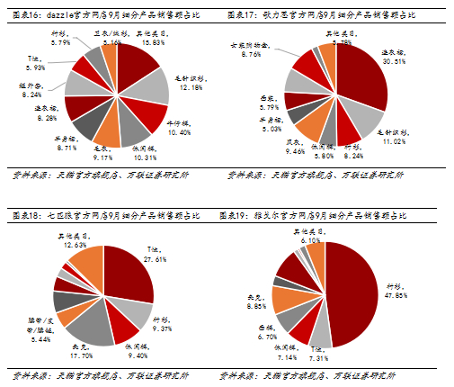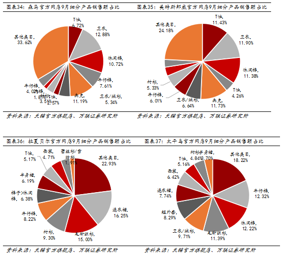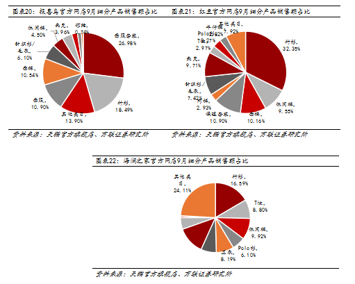 品牌旗舰店品类占比分析:9月品牌天猫旗舰店数据显示,休闲服装品牌主要收入品类主要包括男女T恤、毛针织衫、休闲裤、夹克以及卫衣,其中毛针织衫占比有所提升。森马收入占比最高的三大品类为卫衣(12.88%)、夹克(11.19%)以及休闲裤(10.72%)。美特斯邦威占比最高的是卫衣(11.90%)、夹克(11.73%)以及T恤(11.43%)。主打女性群体休闲品牌方面,拉夏贝尔收入中16.25%来自于连衣裙,相较上月下降17pct。太平鸟主要收入品类为牛仔裤(12.32%)、休闲裤(12.22%)和毛针织衫(11.39%),收入结构较上月变化较大,其中西装收入占比下降5pct,牛仔裤占比回落。