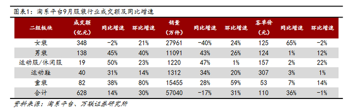 服装行业:9月淘系平台服装行业成交额为628亿元,同比+14%,环比+30%