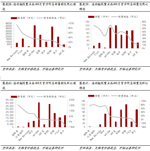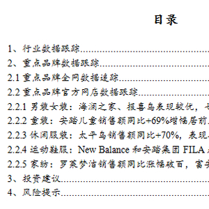 9月,淘系平台数据显示,男装和童装板块的品牌整体表现较好。女装品牌,dazzle销售额为3041万元,同比+25%,环比-2%;歌力思销售额为809万元,同比-13%,环比-12%,表现欠佳。男装方面,跟踪的4个重点品牌继续延续上月增长趋势,均实现全网销售额同比正增长。其中报喜鸟销售额同比+95%,海澜之家同比+92%,涨幅居前。童装方面,安踏儿童销售额同比+57%,表现亮眼;安奈儿、巴拉巴拉分别销售额同比+38%/31%。休闲服装方面,太平鸟销售额同比+43%,增幅明显,而森马和拉夏贝尔销售额同比增速录得-18%/-90%,表现持续低迷,美特斯邦威增速转正为负为-18%。运动鞋服方面,8个品牌中除361°外销售额实现同比正增长,New Balance和安踏集团旗下FILA表现最好,销售额同比+80%/+94%,在重点品牌中排行前两名。361°表现较为逊色,同比录得-6%。从环比涨幅来看,除李宁(-4%)外其余品牌环比实现正涨幅。
