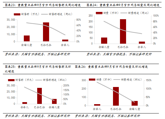 9月天猫官方旗舰店数据显示,跟踪的3个重点童装品牌:安踏儿童、巴拉巴拉、安奈儿天猫官方网店分别实现销售额8338、26315、2759万元,同比+69%/+58%/+24%;各品牌实现销量为56.56、220.86、19.10万件,同比+80%/+49%/+36%。3个品牌整体表现较好,其中安踏儿童涨幅最为亮眼。量价拆分来看,3个品牌官方网店单件成交均价平稳,主要是量升推动销售额增加。