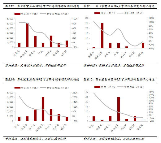 9月天猫官方旗舰店数据显示,跟踪的5个重点男装品牌:海澜之家、报喜鸟、七匹狼、雅戈尔、红豆官方旗舰店分别实现销售额5108、977、1461、2426、899万元,同比+81%/+85%/-11%/+46%/+40%;实现销量25.07、1.26、5.77、5.51、5.17万件,同比+57%/+101%/-4%/+30%/+63%;男装板块除了七匹狼品牌同比录得负增长外,其余品牌旗舰店销售额增长明显。跟踪的重点女装品牌dazzle和歌力思,其官方旗舰店实现销售额分别为2521、867万元,同比+6%/-7%,实现销量2.27、0.67万件,同比+0.4%/-27%。