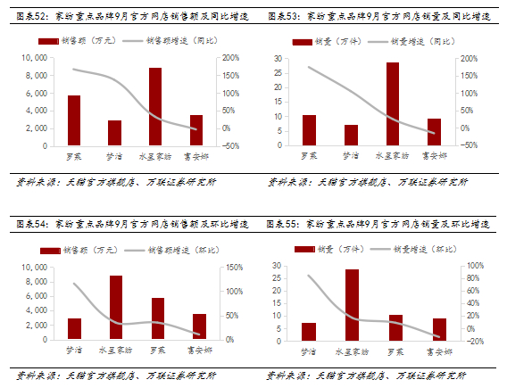 9月,跟踪的4个重点家纺品牌中:罗莱、水星家纺、富安娜、梦洁官方旗舰店分别实现销售额5766、8881、3607、3003万元,同比+167%/+33%/-2%/+137%;各品牌实现销量为10.70、28.79、9.35、7.31万件,同比+175%/+26%/-15%/+106%。富安娜销售额同比增速由正转负,其余品牌同比增速均扩大。
