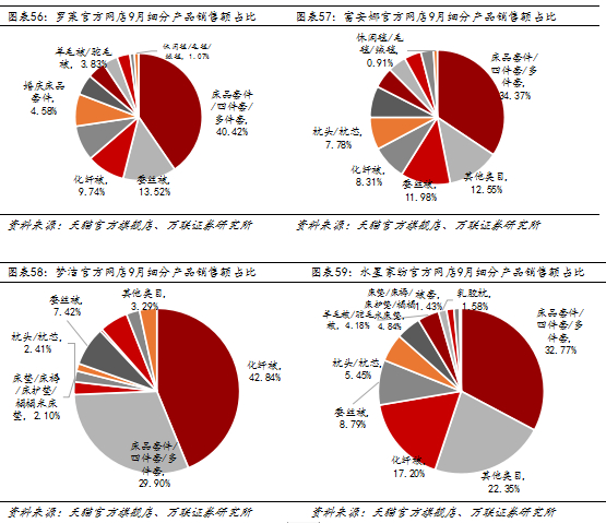品牌旗舰店品类占比分析:9月品牌天猫旗舰店数据显示,跟踪4个品牌店铺最为畅销的品类为床品套件/四件套/多件套,其中梦洁传统四件套收入占比较8月下降14个pct, 化纤被占比42.84%跃至第一。其余品牌的化纤被本月收入占比均维持在12%以内。