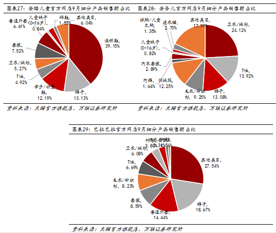 品牌旗舰店品类占比分析:9月品牌天猫旗舰店数据显示,巴拉巴拉官方旗舰店收入占比较高的品类依次为裤子(18.67%)、普通外套(14.44%)、套装(8.59%);安踏儿童官方旗舰店收入占比较高的品类依次为运动鞋(39.15%)、裤子(13.13%)、学步/幼童鞋(12.19%);安奈儿方面,其店铺收入三大来源依次为卫衣/绒衫(24.12%)、T恤(13.92%)和裤子(13.08%),连衣裙占收入比重继续下滑至2.70%。