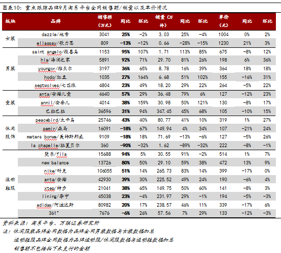 原标题:9月纺织服装电商数据跟踪:男装、童装、运动鞋服高增长 报喜鸟、海澜之家表现抢眼 来源:万联证券研究所