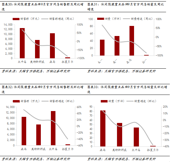 9月天猫官方旗舰店数据显示,跟踪的4个重点休闲服装品牌中:太平鸟、美特斯邦威、森马、拉夏贝尔现销售额12540、7720、10473、499万元,同比+70%/-20%/-27%/-88%;各品牌实现销量43.60、53.60、81.76、2.07万件,同比+67%/-23%/-26%/-86%。