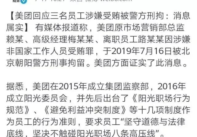 去年7月16日,美团曝出大案——其原市场部总监赖某、高级经理梅某某、已离职员工路某某涉嫌非国家工作人员受贿罪,已被朝阳市警方刑拘。