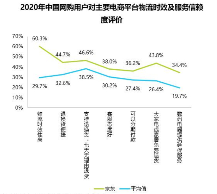 艾瑞方面称,在京东物流的时效、售后及增值服务表现上,调研结果显示,超六成用户认为京东的物流时效性高、发货速度快,显著高于行业均值。从网购用户对主要电商平台的售后/增值服务信赖度评价来看,京东在物流时效性、退换货便捷、客服态度好、提供分期、大家电或居家免费送货及延保服务这些维度上的信赖度评价最高。